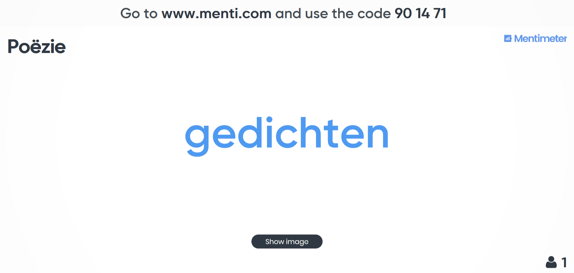 Bij een nieuw onderwerp test ik heel vaak de voorkennis door middel van een Mentimeter. De leerlingen/studenten kunnen met hun device naar www.menti.com gaan. Op het bord staat een code die ze moeten invullen. Aan de linkerkant van het scherm staat een woord (nu poëzie). Het is de bedoeling dat de leerlingen/studenten alle woorden invullen die hen doen denken aan het woord poëzie. Op die manier krijg je een soort van woordweb.